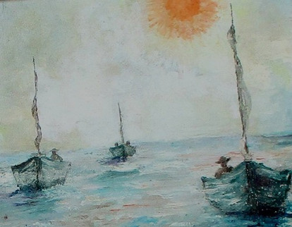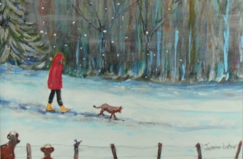 In Winter Walk, a sole figure follows a small animal in the snow by the edge of the woods. It is a serene scene of solitude, and touchingly shows the companionship we can find in animals. On the other hand, Storm is Coming is a sublime painting full of energy; abstract stormy waves blend into an angry sky, and birds are caught in the fray.